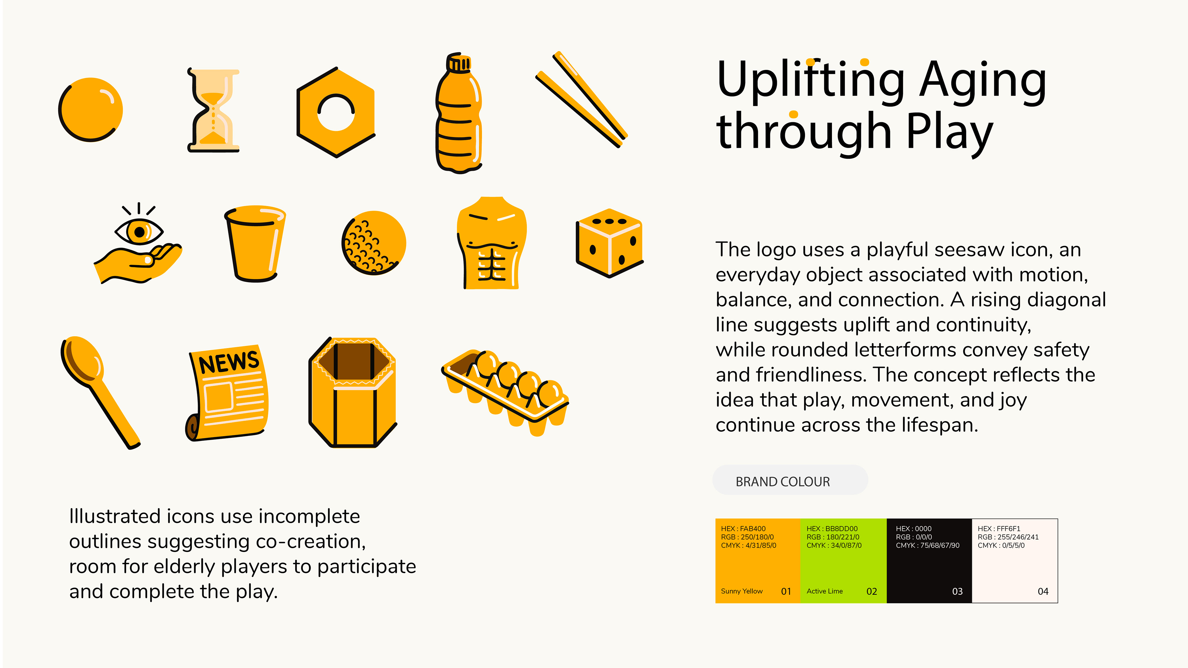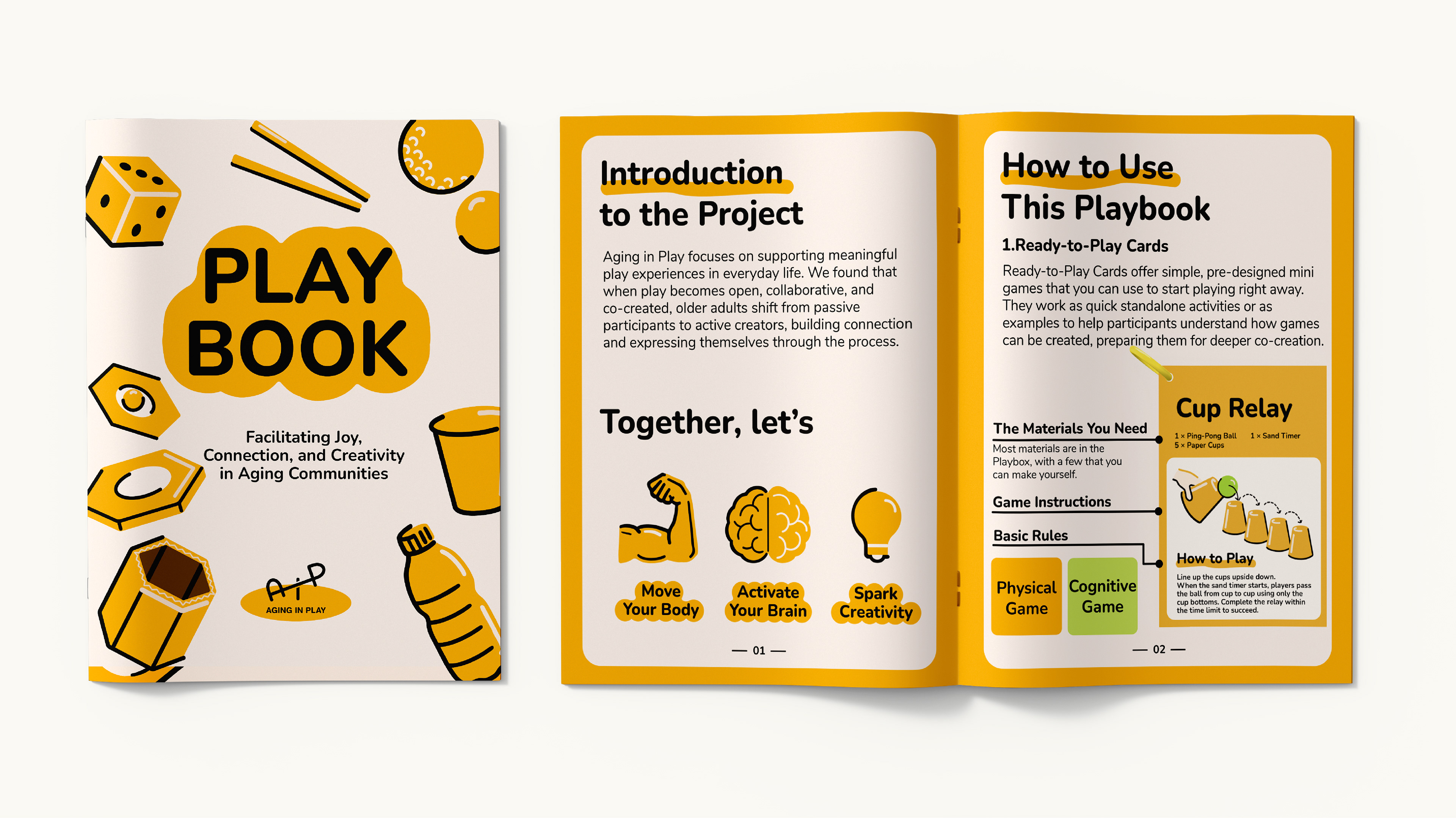 PlayBox serves as the core product within the Aging in Play system: a modular, community-powered play toolkit designed for older adults. It translates research insights into low-barrier, adaptable game experiences that can be easily facilitated in community centers and shared spaces. Through standardized components, clear visual language, and flexible rules, the system supports diverse abilities while enabling scalability and long-term community ownership.