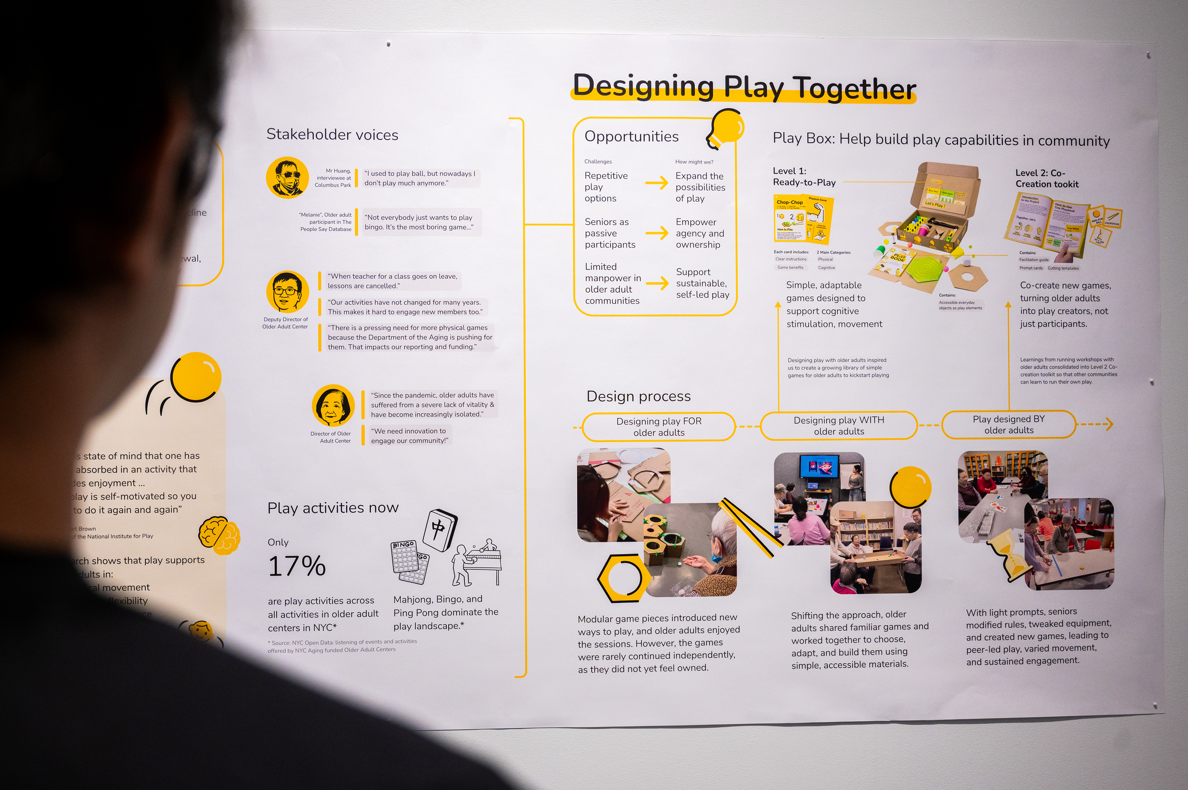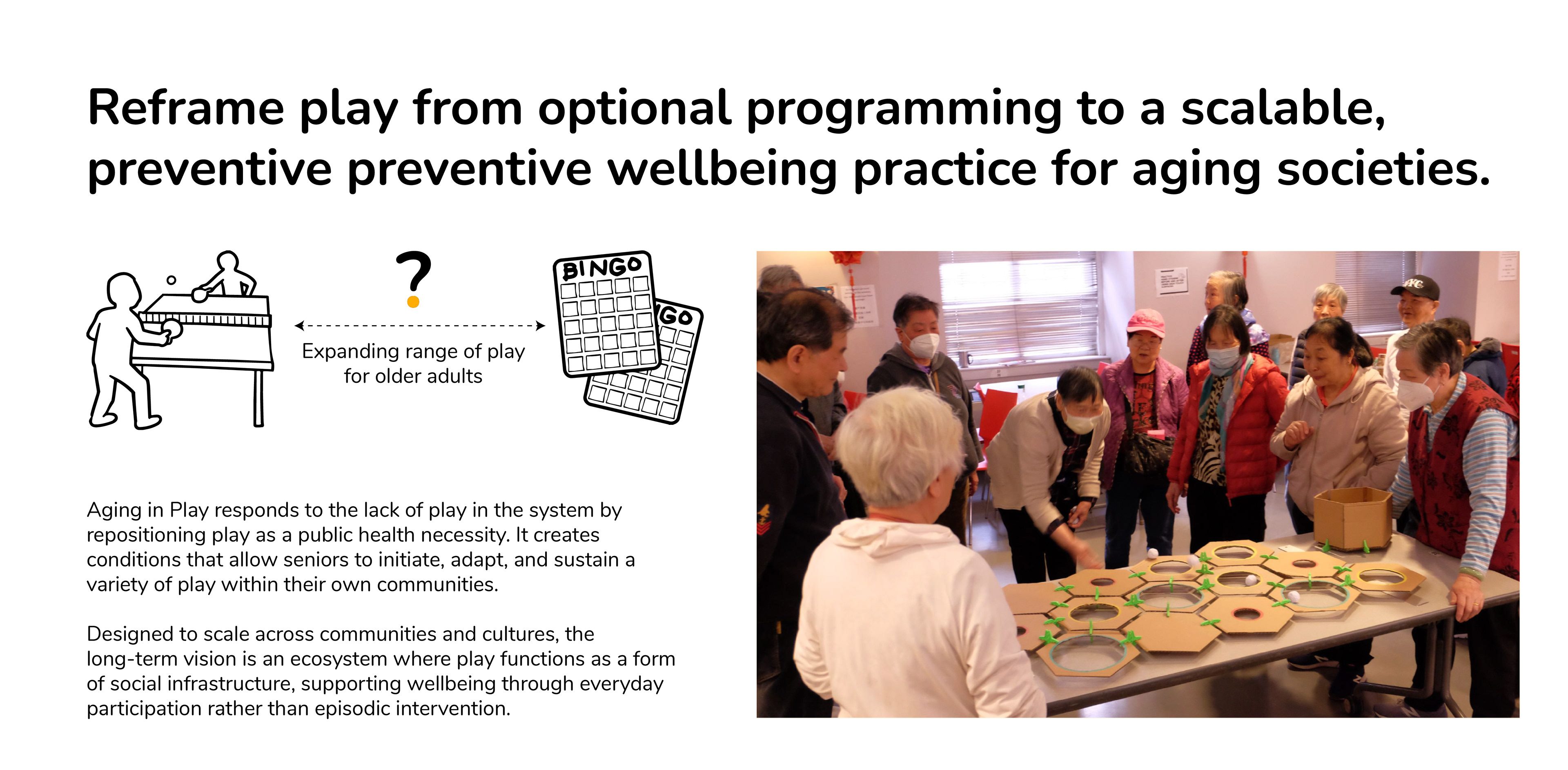 Aging in Play × PlayBox is a design-led system that explores how play can support physical, cognitive, and social well-being as people age. Grounded in research, community engagement, and co-creation, the project reframes play as everyday infrastructure that supports movement, connection, and dignity rather than momentary entertainment.